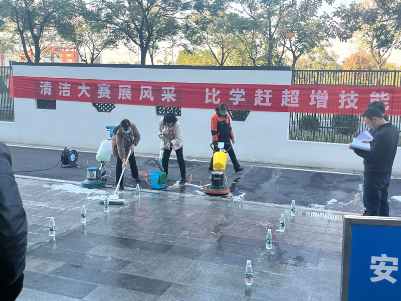 此次大賽分理論知識和操作技能兩部分。理論知識主要考核選手對專業(yè)理論知識的掌握程度;技能實操則從清潔機械操作、玻璃清潔等方面進行現(xiàn)場考核。