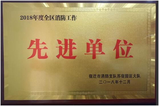 公司在2018年度全區(qū)消防安全工作評定中,喜獲“2018年度全區(qū)消防工作先進(jìn)單位”榮譽(yù)稱號,此次消防安全工作由宿遷市消防支隊(duì)蘇宿園區(qū)大隊(duì)評定。